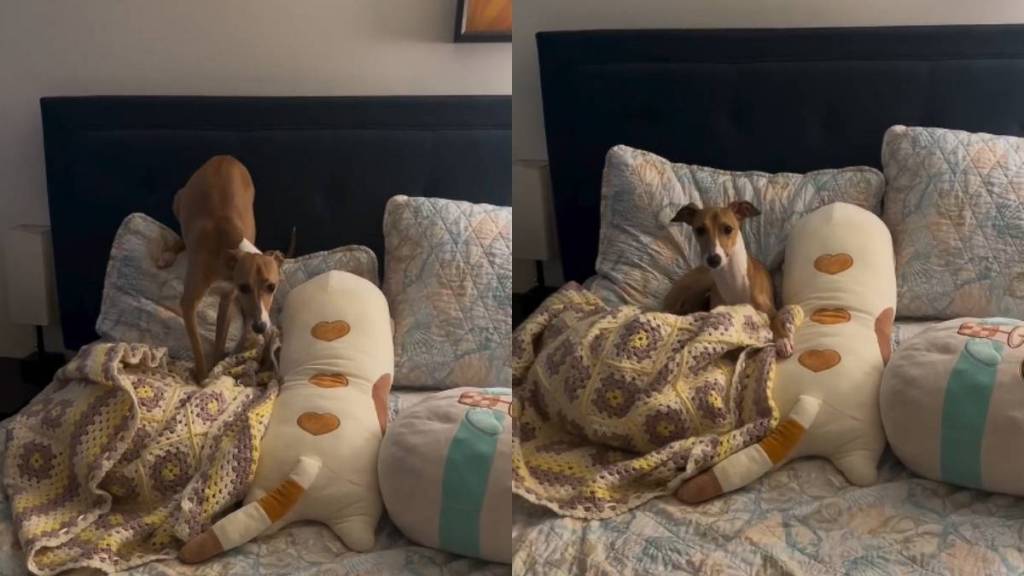 In a new video posted on @mikitheiggy, this sweet dog is busy turning the bed into a nest. Miki has his large plushie toys and blanket ready. But it isn’t quite right yet. He spends several minutes working on the cushions. He won’t just lie down. This pup needs everything to be in its exact place before he can enjoy his nap.