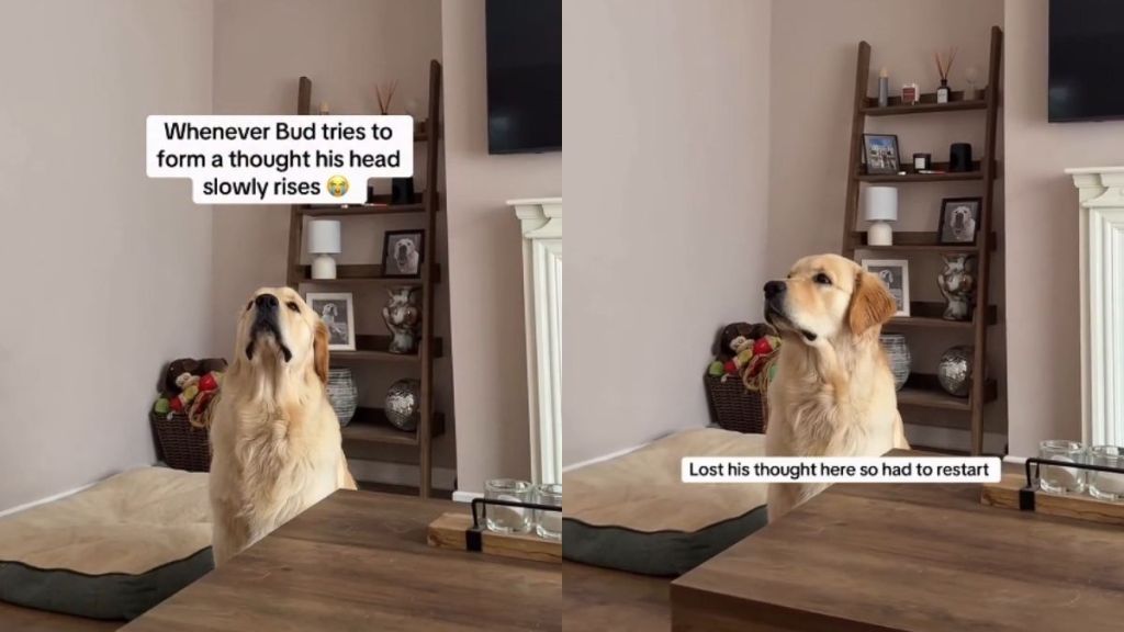 This video shows us what happens when the dog actually tries to form a single thought. It involves a lot of slow-motion lifting of the head. The Golden Retriever just sits there by his bed, and then his chin starts to move upwards. It is the funniest thing to watch.