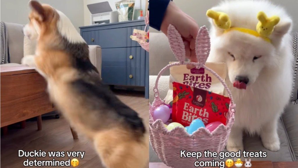 This video from @biffthesamoyed shows exactly how an easter egg hunt goes down with two very different pups, like a Samoyed and a Corgi. You have Biff sitting on the couch, wearing the most adorable bunny headband. Meanwhile, Duckie is sniffing and checking out the treat basket that their human is holding out. And they both know it is game time; it is just the most wholesome thing ever. They are so ready to find everything that’s inside those eggs, just for the sake of curiosity.